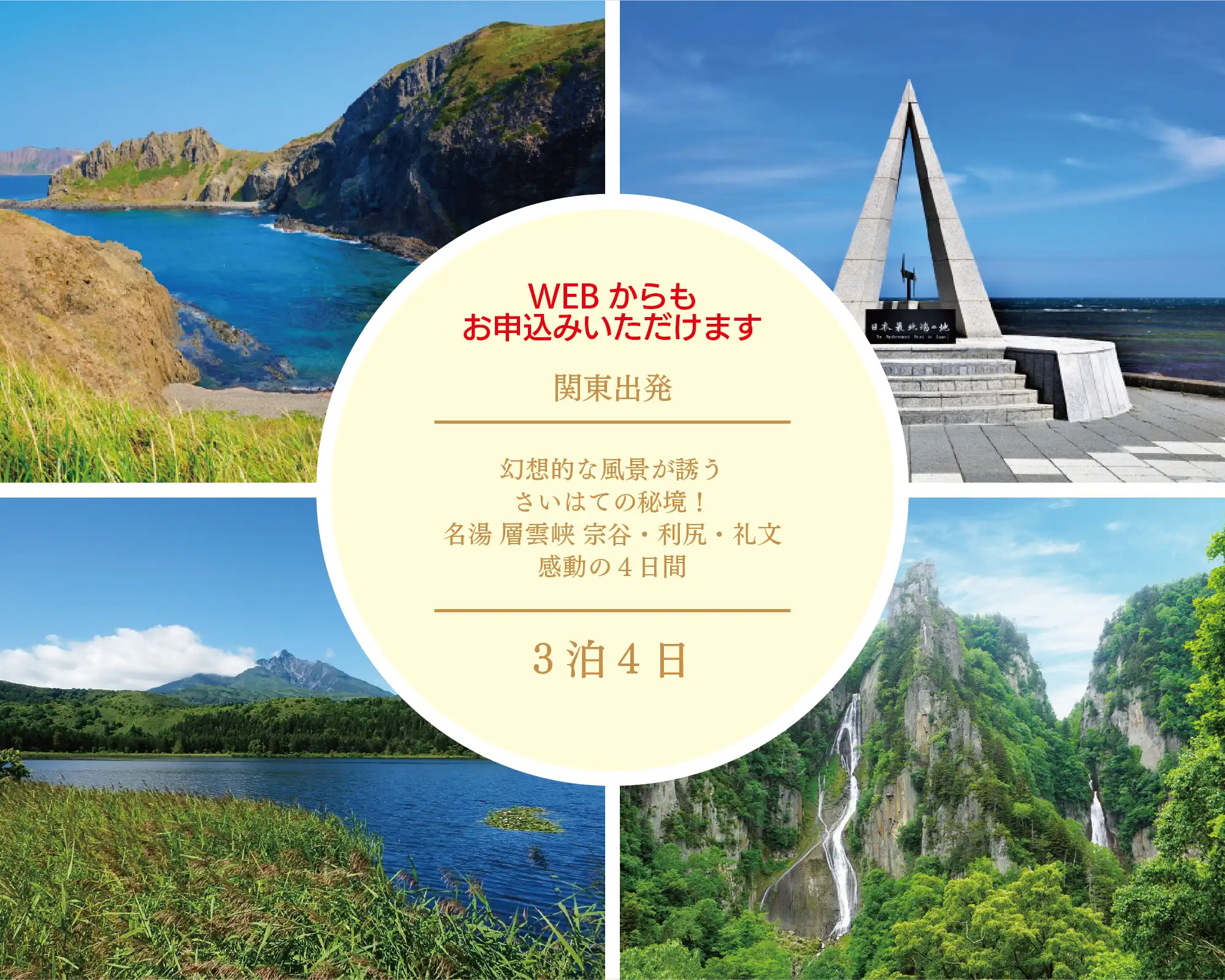 3泊4日 5月・6月 189,900円(税込) 【中部・北陸・中四国・岡山版】さいはての秘境!名湯 層雲峡 宗谷・利尻・礼文 感動の4日間