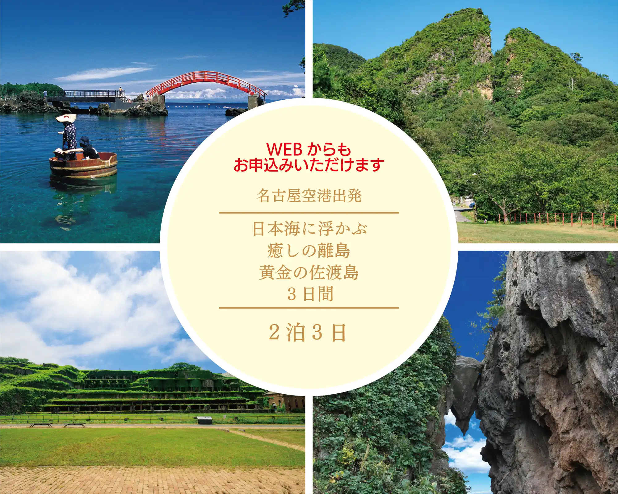 1泊2日 4~5月 129,900円(税込) 時が止まったような街並みと自然に浸しむ休日 日本海に浮かぶ癒しの離島 黄金の佐渡ヶ島3日間